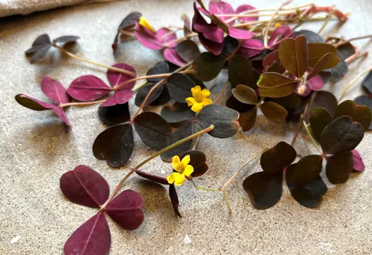 Röd oxalis innehåller c-vitamin. Den är nyttig men innehåller även oxalsyra vilket man inte bör äta i stora mängder.
