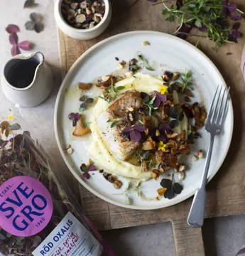 Plocka av bladen och lägg hela på tallriken. Det tillför både god smak och ger en fin dekoration. Även de gula blommorna är goda att äta. Skär fina bitar av stjälken där det också sitter mycket smak. Röd Oxalis ska du tillsätta sent i matlagningen. Den ska inte upphettas för då tappar den sin smak.