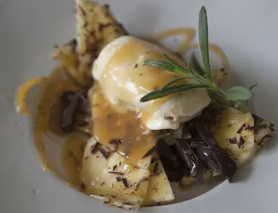 Limemarinerad ananas med kolasås