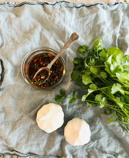 Het och syrlig kålsallad med äpple, mynta och koriander