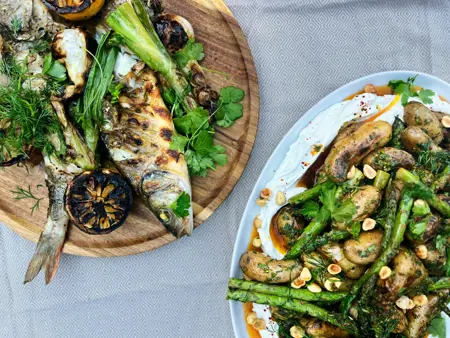 Örtig havsabborre med grillad primörsallad och brynt salsa verde