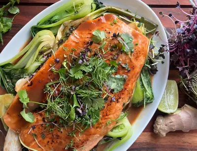 Ugnsbakad lax med misohonung, pak choi & ört- & krassemix