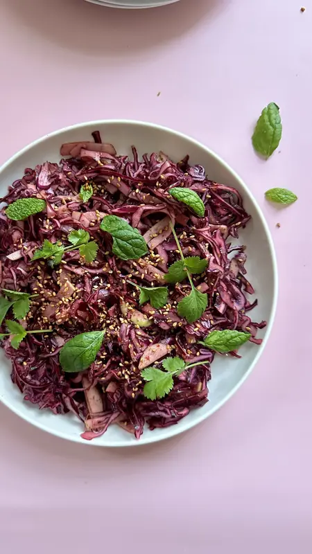 Het och syrlig kålsallad med äpple, mynta och koriander