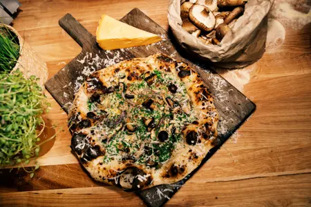 Smördegspizza med krasse och kantareller